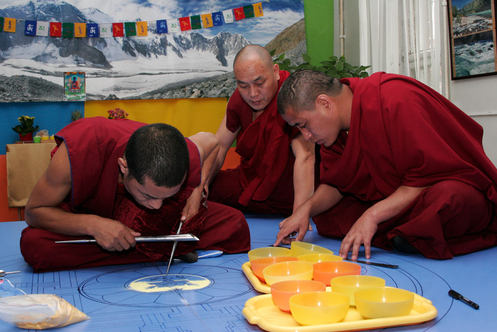 Делегация из тибетского монастыря Дрепунг Гоманг – крупнейшего университета по изучению философии, медицины, астрологии – прибыла в Новосибирск познакомить сибиряков с буддистской культурой. До этого монахи были в Калмыкии, затем в Краснодаре, Перми и Омске. После Новосибирска планируют отправиться в Бийск и Барнаул, а завершится нынешний тур в столице. Помимо построения мандалы в городах тура монахи читают лекции, демонстрируют фильмы (не аутентичные, зато мастерски снятые западными умельцами из GEO и National Geographic), в Новосибирске вдобавок еще и организована фотовыставка местных художников и фотографов под названием "Чистая страна" – с пейзажами, зарисовками, портретами, а главное – пониманием авторами некой страны мечты.