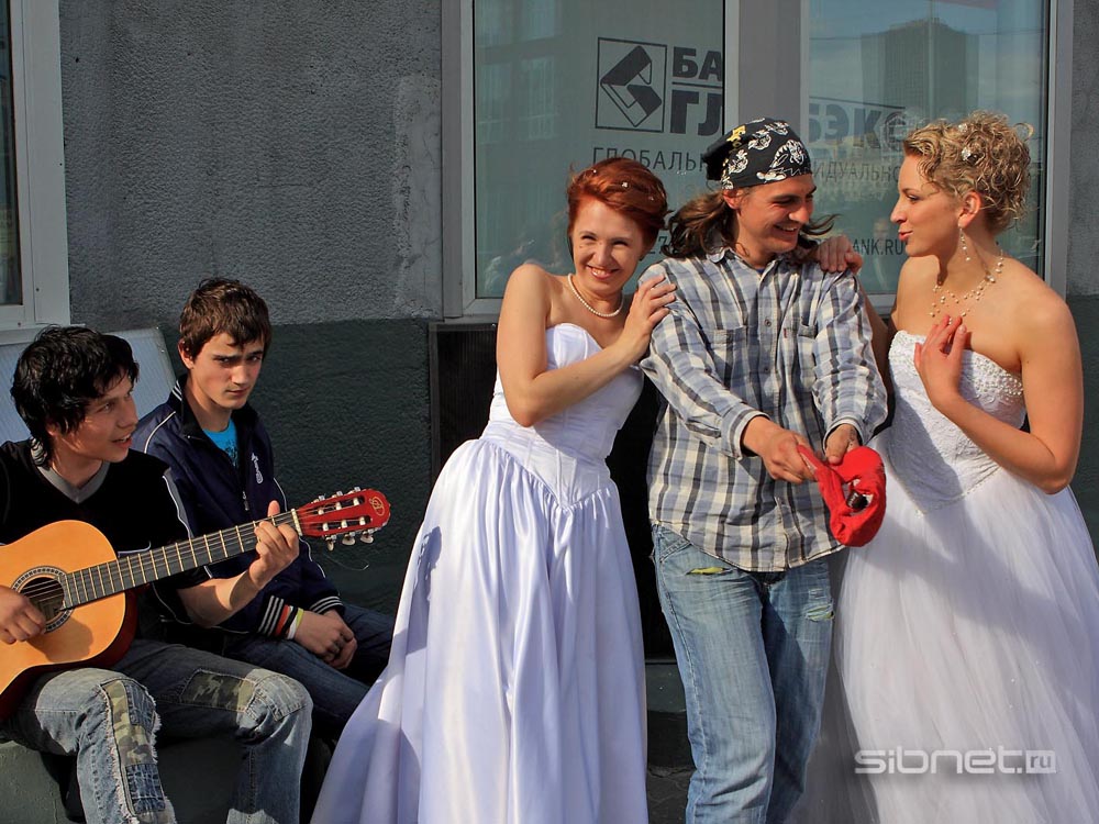 В пятый раз по центру Новосибирска продефилировали девицы в свадебных нарядах и с позитивно-агрессивными матримониальными намерениями. Организаторы уверяют, что естественным результатом мероприятия с названием "Кураж невест" станут свадьбы и, как следствие, повышение рождаемости в стране.