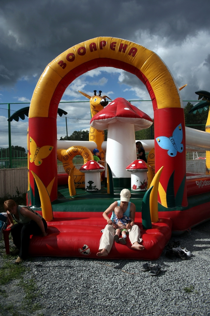 Вопреки стереотипам, первое, что видел любой пришедший на фестиваль, – это отдельно огороженная детская площадка. На протяжении всего вечера там работала альтернативная программа конкурсов (ведущие отважно старались перекричать основную сцену), а дети с разрисованными студией мейкапа лицами веселились на аттракционах. Разношерстная публика плотным кольцом окружала стол для армрестлинга: состязания проводил чемпион Европы Рустам Камчиев, президент ассоциации армрестлеров Новосибирска.
