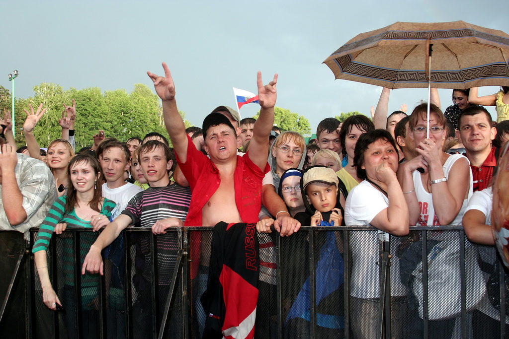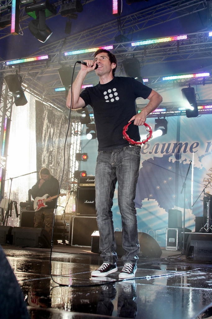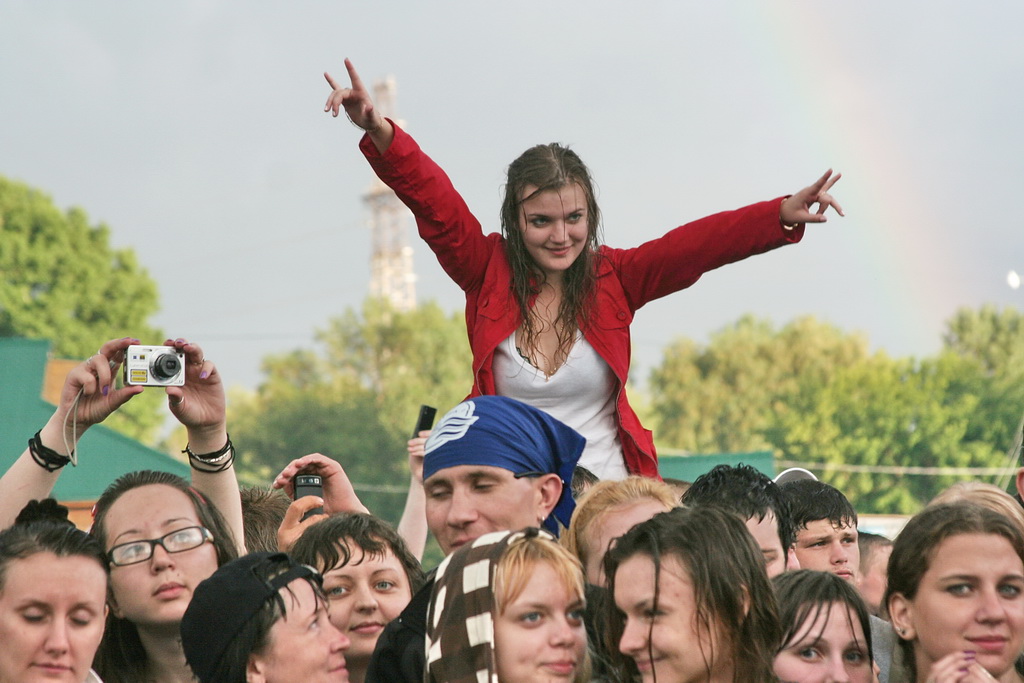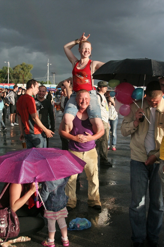 Немного радужного благословения досталось и группе "Банд'Эрос", выступавшей следом. Правда, солнце вскоре зашло, зато похолодание побудило к активным танцам свежий людской приток (состав публики большей частью сменился: все же слишком разных музыкальных направлений придерживаются хэдлайнеры фестиваля). Ни для кого не секрет, что изначально в Новосибирске ждали "БИ-2". Максим Федоров, один из организаторов мероприятия, пояснил: ""БИ-2" подтвердили свой концерт в Киеве, и велик был риск, что в Новосибирск они не успеют. В качестве замены был выбран не менее популярный коллектив, ориентированный на аудиторию обеспеченных молодых людей 25-35 лет".