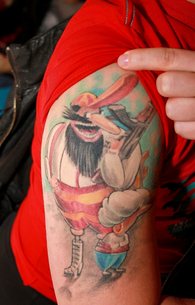 На плече мультгерой из "Колобков" (м/ф "Следствие ведут колобки" – прим. ред.) – Карл Бофос. Это тот, кто украл слона. Хахахахахаа я ржу в истерике, ну дибилы.