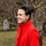 Людмила Соловьянова (костюм цвета темной фуксии с удлиненным кардиганом, более светлый шарф в тон):