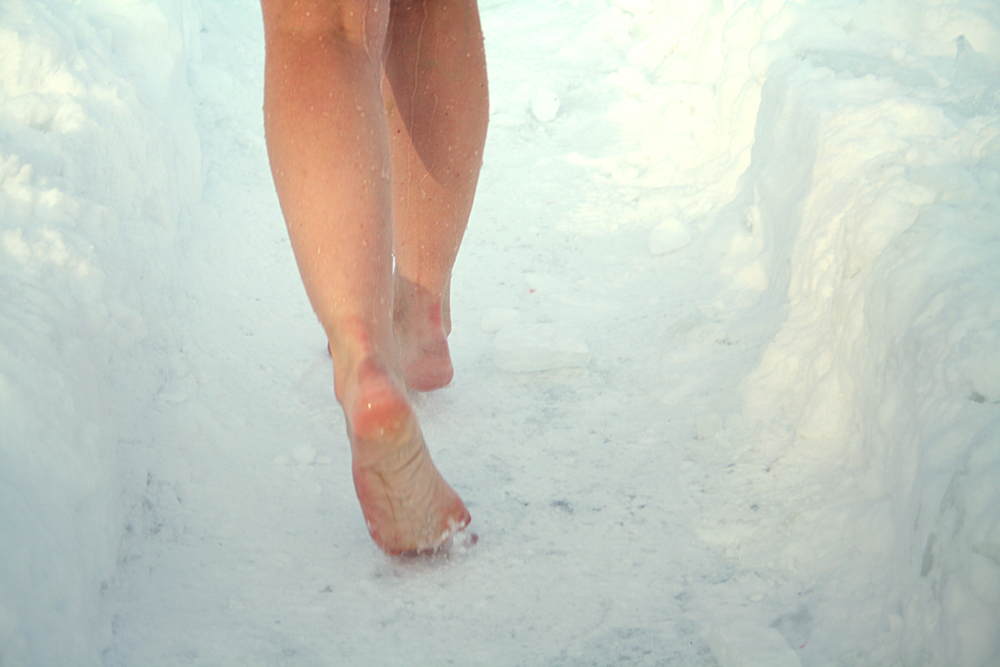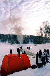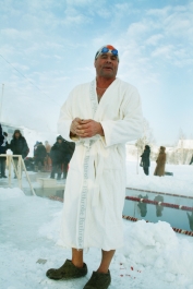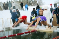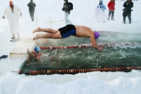 Нелли Андреевне 70 лет и она морж. Уверяет, что занимается экстремальным закаливанием с божьей помощью, ведь прорубь – настоящая благодать. В день соревнований температура воздуха была -32 градуса, воды – всего полградуса. Но "снежных людей" это лишь взбодрило. Тем более что если быстренько бежать, то пяточки ко льду почти не примерзают, а после заплыва ждет обогрев в полевой бане.