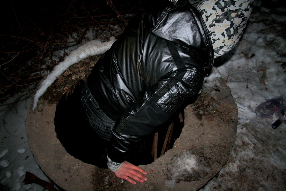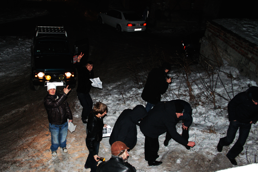 Подкатив к означенному месту, мы начали копошиться в сугробе, помеченном на фото крестиком. Позже к нашим увеселениям подключились еще два экипажа. Вообразите: дюжина взрослых людей увлеченно роется в снегу и снимает на цифру драный мешок, обрубок доски, флакон из-под "Тройного одеколона". В общем, мы перелапали все "сокровища" бомжей, ничуть не смутясь, и даже залезли в колодец, пока до всех не дошло, что надо не рыть, а логически переваривать свидетельские показания.